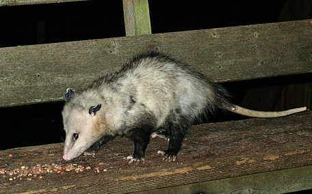 Or if you're from the South, just plain "possum.". The possum is quite an unusual animal. It is North America's only marsupial, having a pouch just like its cousin, the kangaroo. It has migrated to the U.S. from Central America, and it can trace it's lineage back over 50 million years. Its ancestors knew the dinosaurs. It has a prehensile tail and is quite a good climber. But it is more awkward on the ground, waddling along on its short legs looking like its feet are sticking to the ground. With a mouth full of teeth, its grimace can look rather fierce, but it is actually quite timid. When threatened, it sometimes "plays 'possum," feigning death until the danger has passed.