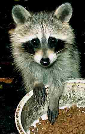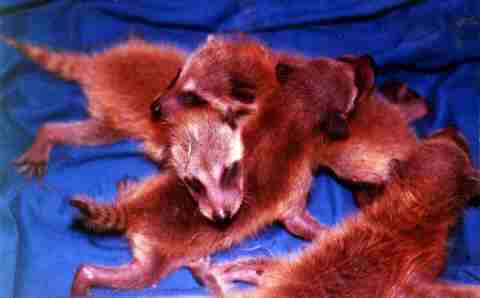 Teddy WashbearsRaccoons are usually born in the spring. In our part of the country that means early- to mid-April. The mothers start bringing the young with them on their nightly outings at around 10 to 12 weeks of age. This means the babies usually start showing up on our deck in early July. But this cute little guy first showed up, with his mother and 3 siblings, in late September. His mother is probably a yearling. Yearling females sometimes don't find a mate till later in the year, and therefore some new babies can still show up in the fall. But the babies grow fast, and our winters are mild, so this guy should have no problem surviving his first winter. NewbornsThese babies were found by my brother, Norman Wittler. They are quite young, maybe 3 weeks or less, because they don't have their eyes open yet. Raccoons, like dogs and cats and many other mammals, are born with their eyes tightly closed. Their eyes continue to develop after birth, and will open when they are completely developed. Another sign of their youth is the rather blunt snout. As they grow, this will become the more pointed, triangular shape we are familiar with. Unfortunately something has happened to the mother of these babies and they are orphans. Fortunately my bother was able to find someone who could raise these babies and re-release them to the wild. This is quite a commitment because, like human babies, they will need to be fed about every 4-5 hours at this early age. (See Remo Coon's excellent site for a page about raising baby raccoons, but also be aware that raccoons, even babies, can be infected with rabies, so adopting wild raccoons is dangerous and also illegal in many states.) The last report I got on these babies was that they were weaned, and are being allowed to explore the wild areas around their adoptive home. Hopefully they will continue doing well. Note: Raccoon coloration can vary quite a lot, from reddish brown to gray to almost black. These babies show a quite red coloration while the raccoons in our area show more gray, and we live only about 70 miles away from my brother. (To see even more color variations visit Damon's Den.) Zurück zur Waschbär-Startseite